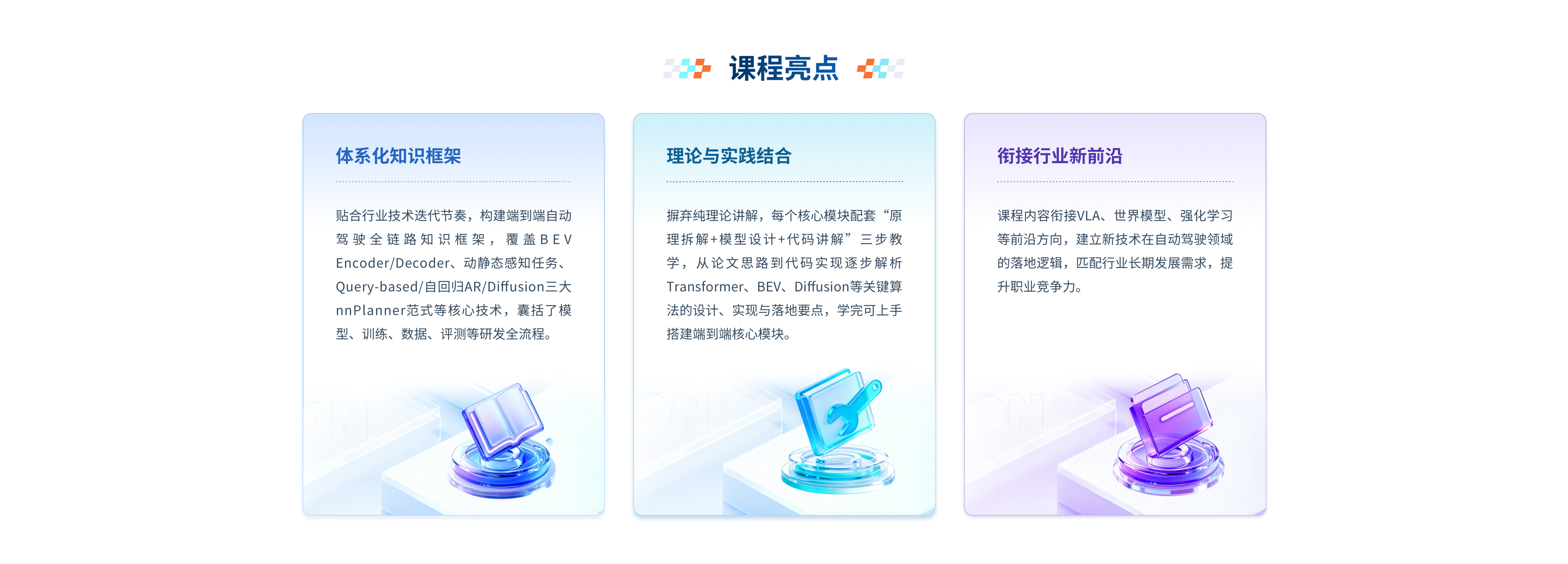 课程项目围绕DriveTransformer进行设计,从宏观到微观、从理论到实践,全面深入地探索并掌握前沿端到端自动驾驶系统。通过四个层层递进的实践项目,从动态与静态感知,到规控决策,再到端到端训练与闭环推理,循序渐进地构建并优化系统,全方位培养自动驾驶领工程实践能力。