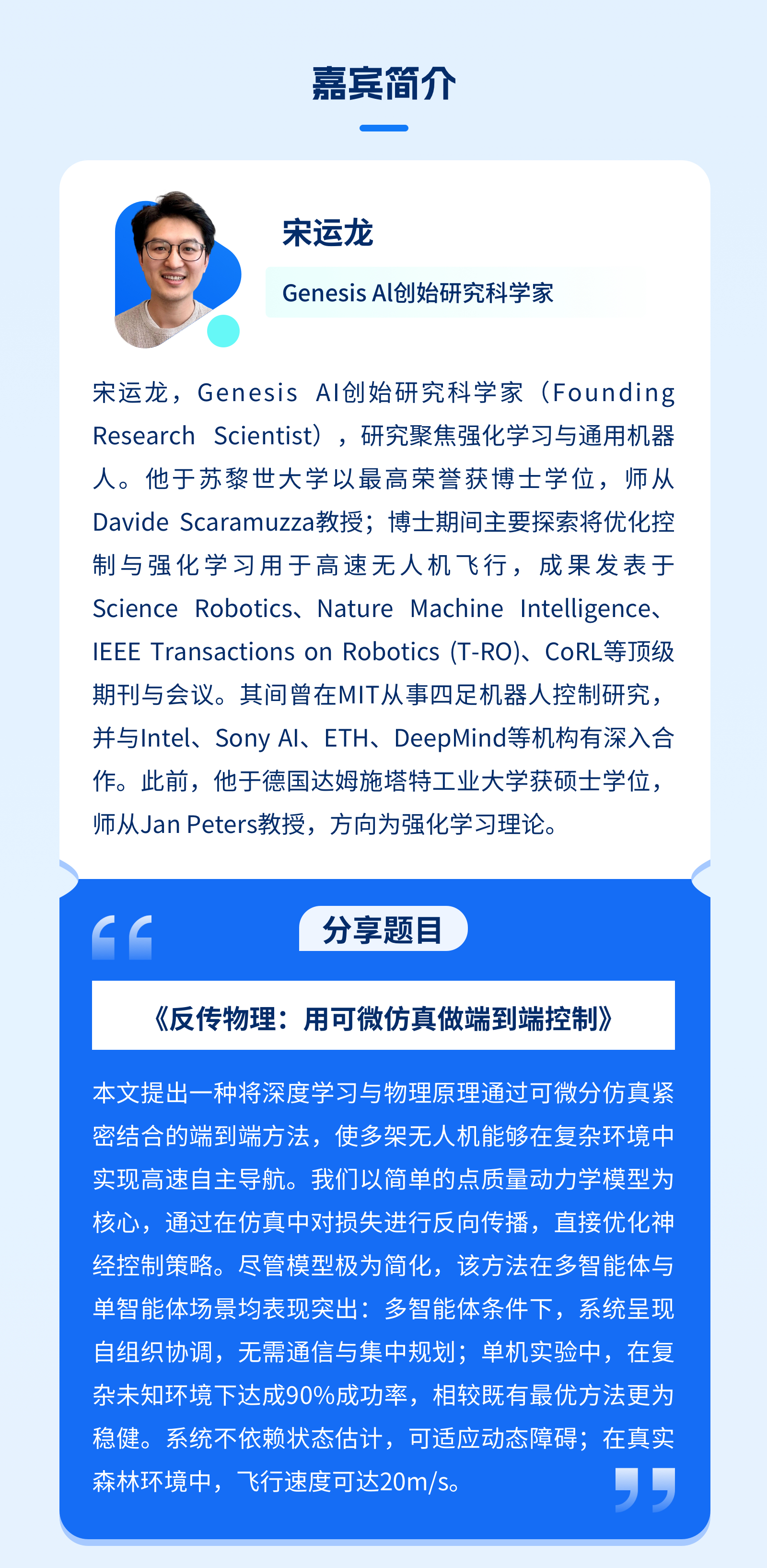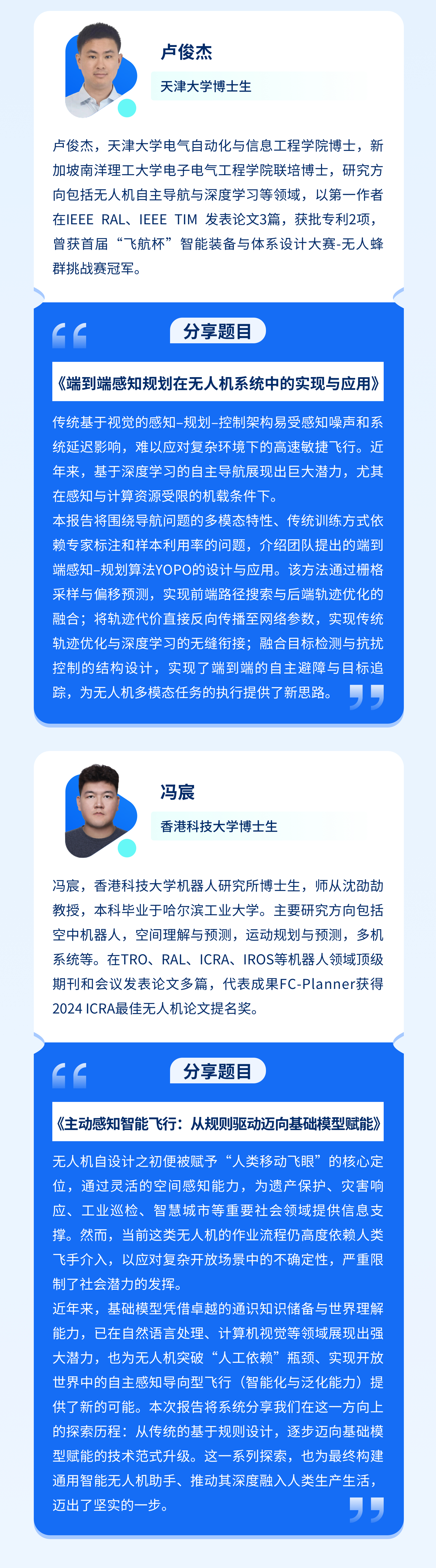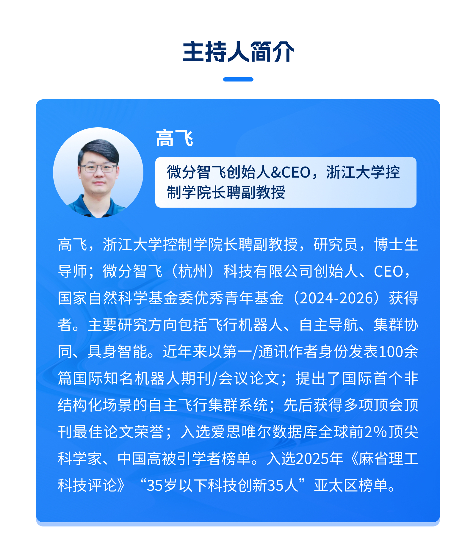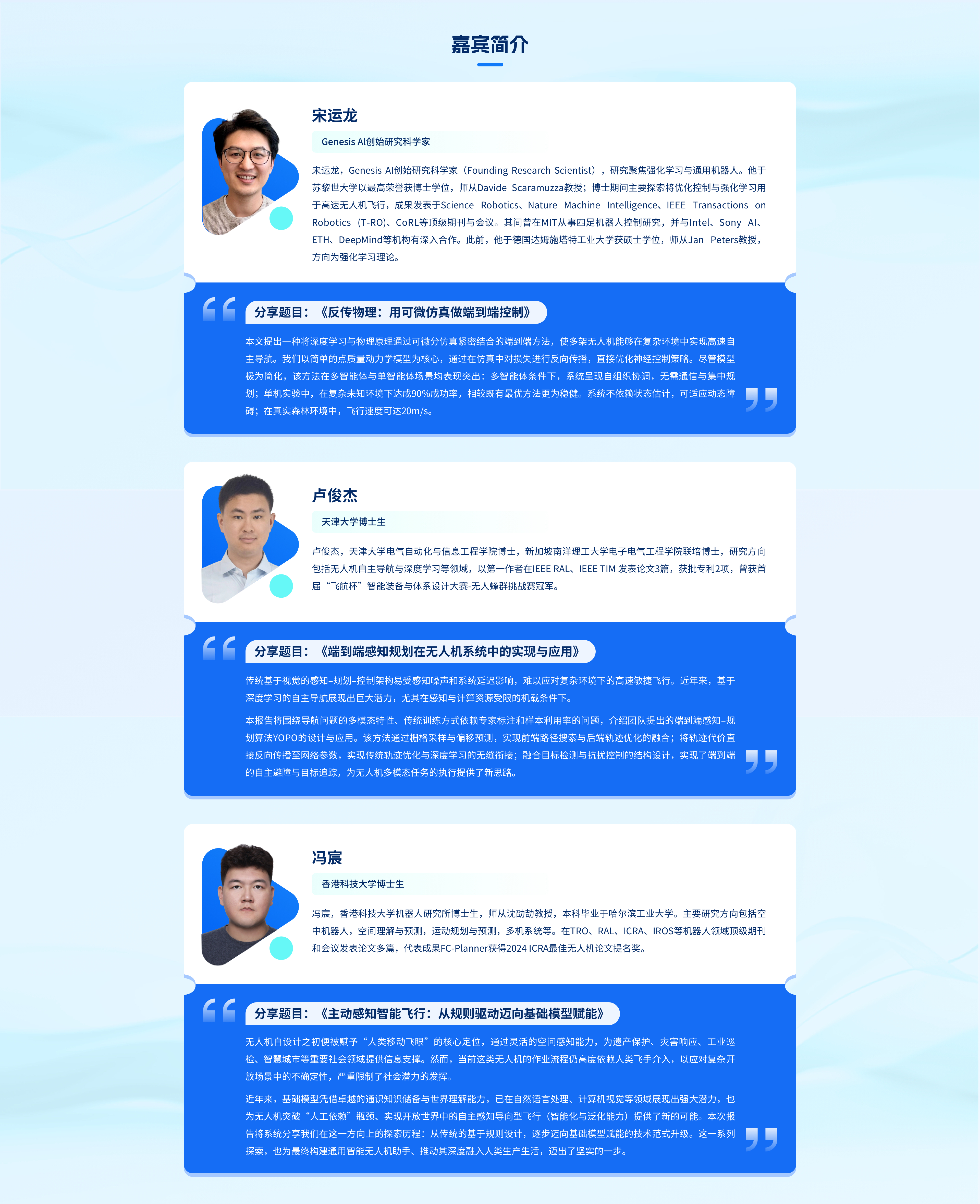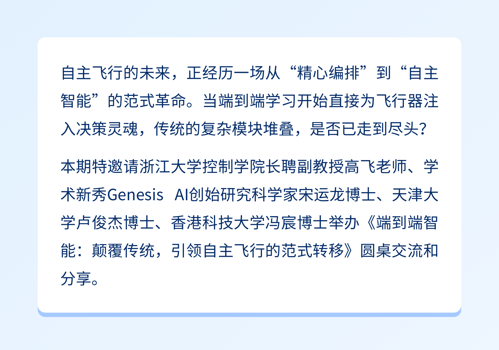 本期特邀请浙江大学控制学院长聘副教授高飞老师、学术新秀Genesis AI创始研究科学家宋运龙博士、天津大学卢俊杰博士、香港科技大学冯宸博士举办《端到端智能:颠覆传统,引领自主飞行的范式转移》圆桌交流和分享。